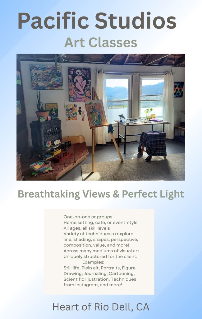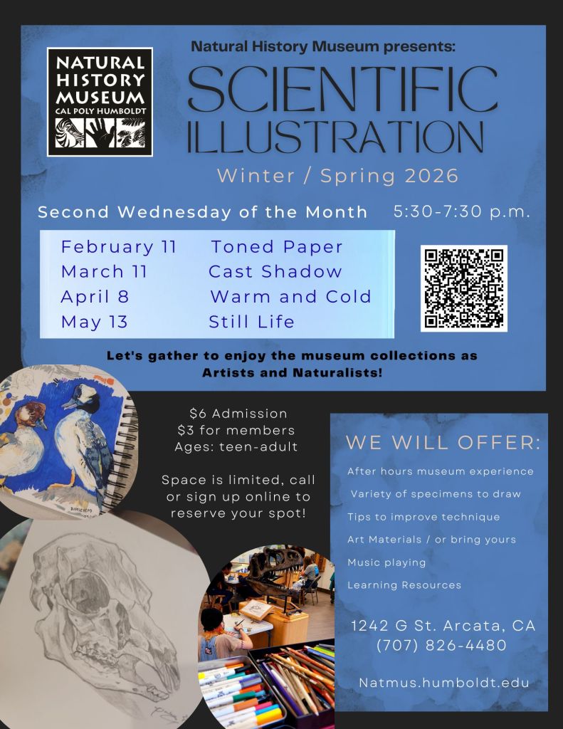 Current Work includes: hosting a monthly Scientific Illustration Class at the local Museum, drawing designs for HBMS, and creating a space for music and art events in Rio Dell, CA.